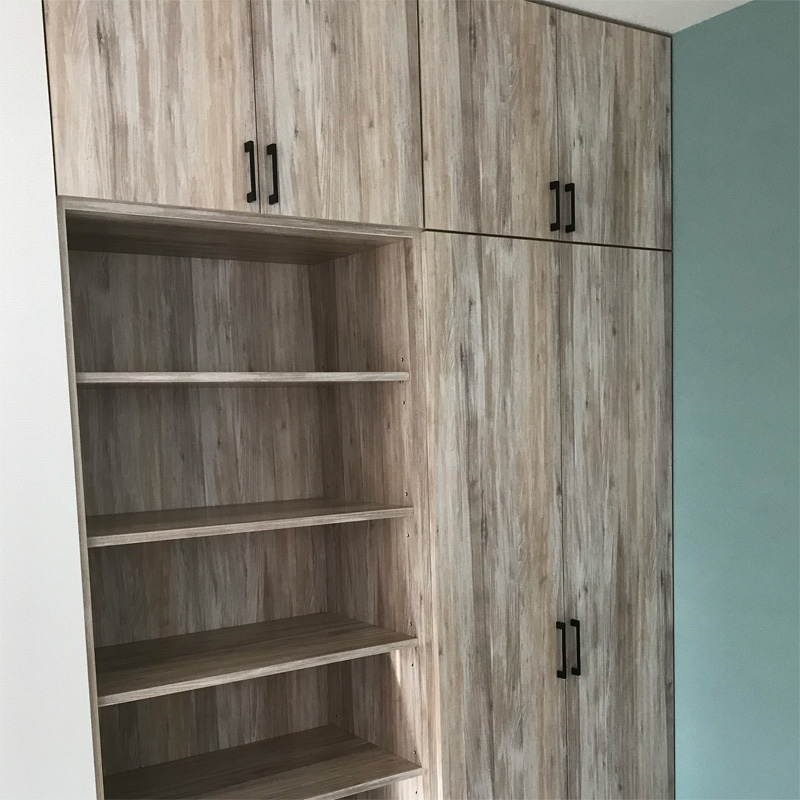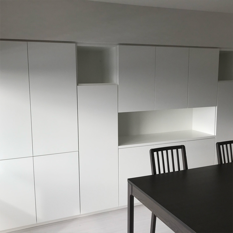 ホワイトで統一された壁一面の収納は、利便性とデザイン性を両立させる収納家具になりました。