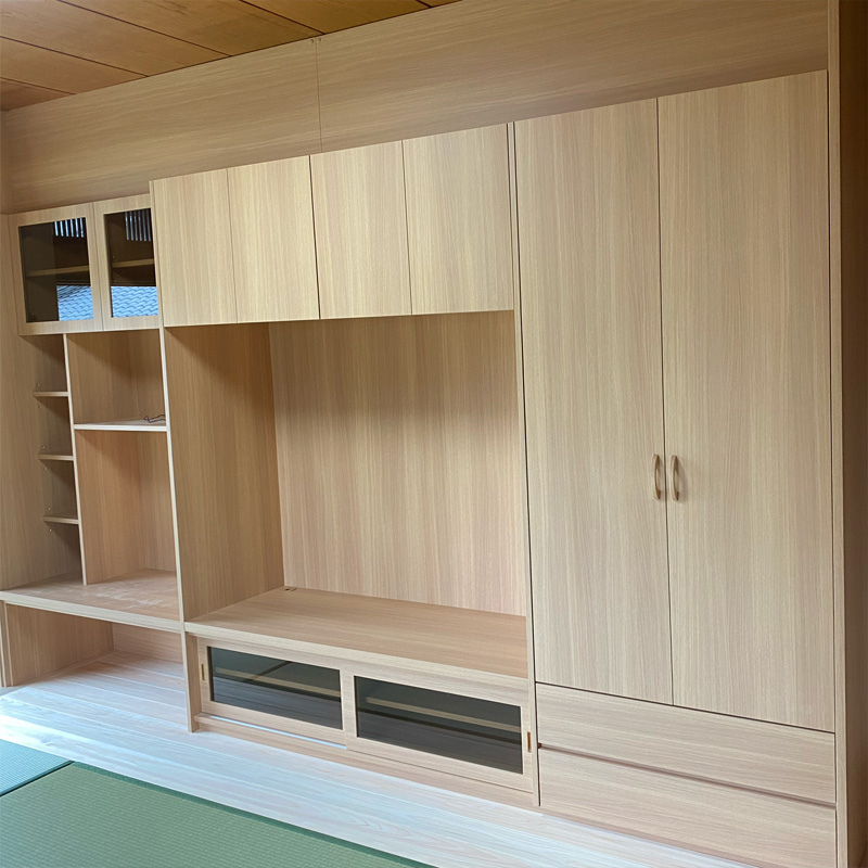 和室の改装にて、テレビボード、パソコン作業台、収納棚を製作しました。木目調の合板で和室に調和した家具になりました。